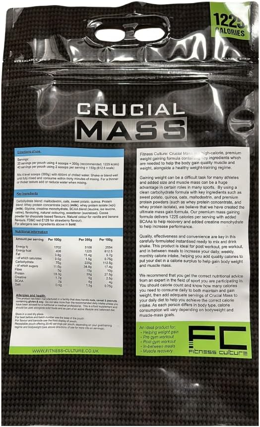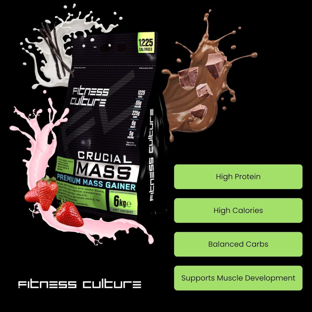 For athletes and fitness enthusiasts striving to build lean muscle. Fitness Culture’s Crucial Mass Gainer offers a science-backed formula designed to fuel muscle growth, enhance muscle recovery, and maximize physical performance. Combining premium carbohydrates, high-quality proteins, and performance-enhancing additives, this mass gainer is engineered to support even the most demanding bulking phases.