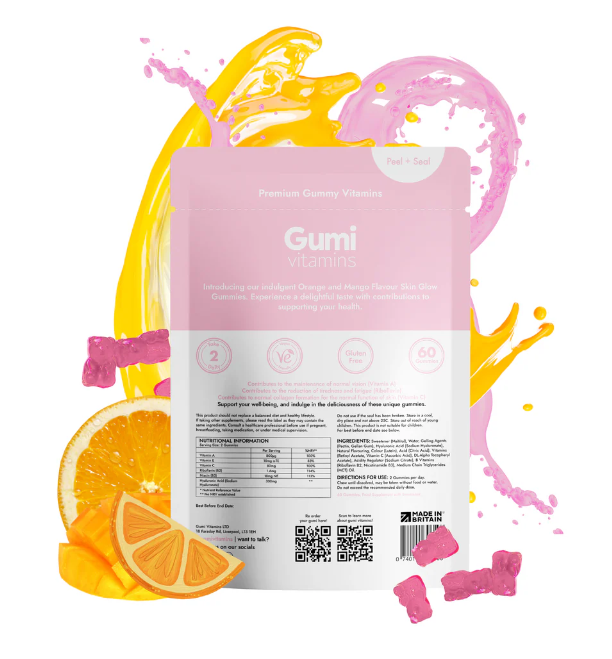 Introducing our Vegan and Gluten-Free Skin Glow Gummies in vibrant orange and mango flavour – the deliciously healthy way to nourish your skin from within!