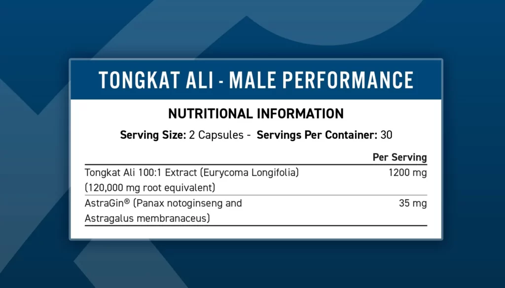 Tongkat Ali (Eurycoma longifolia) 100:1 Extract, Capsule (Hydroxypropyl Methyl Cellulose), Bulking Agents (Microcrystalline Cellulose, Magnesium Stearate), AstraGin® (Panax notoginseng and Astragalus membranaceus).